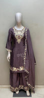 Elevate your festive charm with this plum handcrafted kurta sharara set, exuding regal sophistication and intricate detailing. The rich plum hue is enhanced with hand-finished work on the neckline, hemline, and dupatta border, creating an ensemble perfect for weddings and evening celebrations. The flowing sharara pants offer effortless grace, while the dupatta completes the ensemble with subtle elegance. Designed for women who appreciate refined craftsmanship and timeless allure.