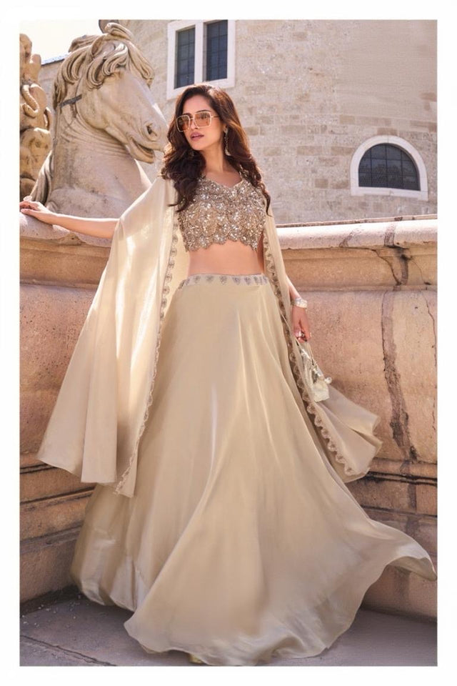 Channel timeless glamour in this Champagne Gold Lehenga Set with Embellished Blouse and Flowing Cape, a statement Indo-Western ensemble for the modern muse. Designed for effortless elegance, this look merges old-world opulence with minimalist chic — ideal for weddings, receptions, or destination soirées.