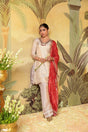 ivory suit set, red dupatta outfit, festive Indian wear, elegant ethnic suit, hand-crafted kurta set, traditional Indian attire
