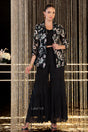 The statement floral jacket, embroidered with soft metallic accents, adds a fresh yet sophisticated dimension to the classic black palette. Paired with a sleek crop top and tiered palazzo pants, the silhouette flows with movement while maintaining a polished, contemporary aesthetic. The coordinated three-piece set transitions seamlessly from festive gatherings to cocktail soirées, making it a versatile addition to any modern wardrobe.