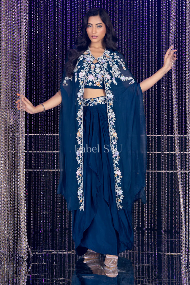 The floral embroidered crop blouse radiates soft glamour, while the flowy layered skirt moves like poetry with every step. Completing the look is the sheer navy cape — delicately embroidered in pastel blooms — adding a halo-like aura of sophistication and drama.