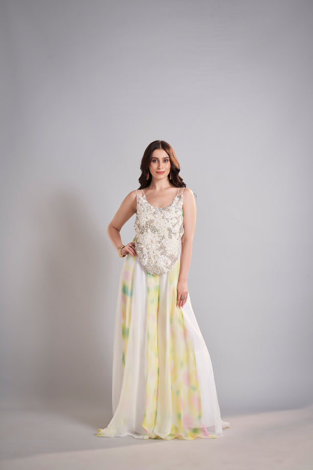 ivory embellished crop top with pastel skirt, pastel watercolor maxi skirt bridal set, embroidered bridal tank top and skirt, couture embellished ivory ensemble, lightweight bridal reception outfit