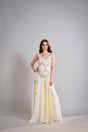 Indulge in ethereal elegance with this metallic ivory embellished tank and pastel watercolor maxi skirt ensemble, a perfect blend of couture artistry and modern grace. The spaghetti strap tank is adorned with elaborate hand-sewn sequins, pearls, and beadwork—creating shimmering texture and a luxe statement. Paired with a flowing maxi skirt featuring dreamy pastel watercolor hues—soft blush, lemon yellow, and mint green—this set offers a whimsical aesthetic with refined poise.