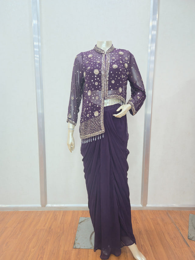 purple drape saree, jacket saree set, embroidered purple outfit, midnight saree set, Mishuuu couture, wedding cocktail outfit, designer Indian ensemble, festive Indian wear, luxury saree set, embellished jacket outfit, pre-draped saree.