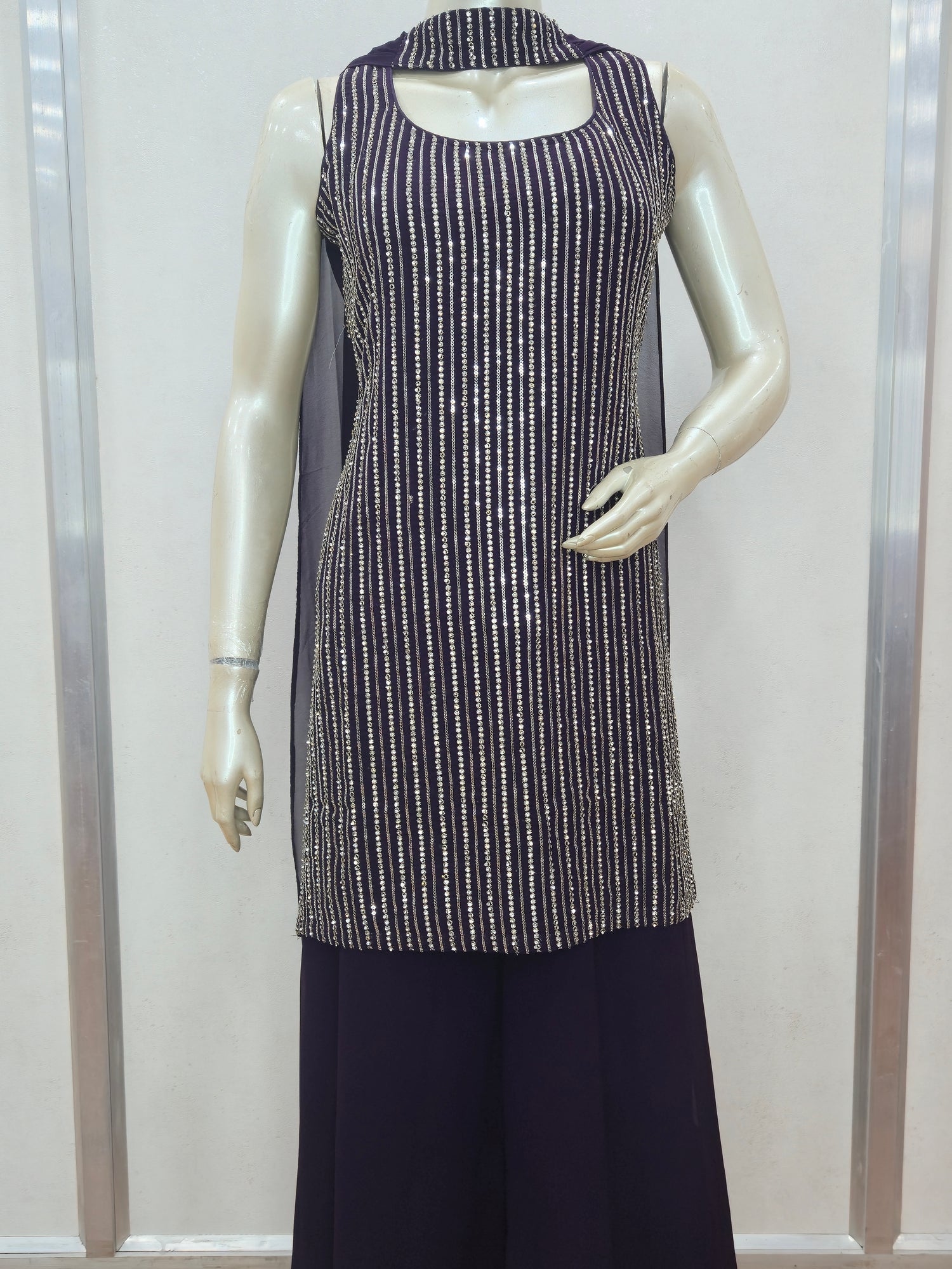 Midnight Purple Sequin Sharara Set – Designer Sleeveless Kurta with Dupatta