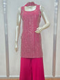 Turn heads in this stunning Pink Mirror-Stripe Kurta Sharara Set, crafted for the woman who loves vibrant elegance. The sleeveless kurta features a full mirror-stripe embroidery design, creating a modern shimmer that catches every light beautifully. Paired with a flowing chiffon sharara and a matching dupatta, this outfit blends traditional charm with a chic contemporary silhouette.