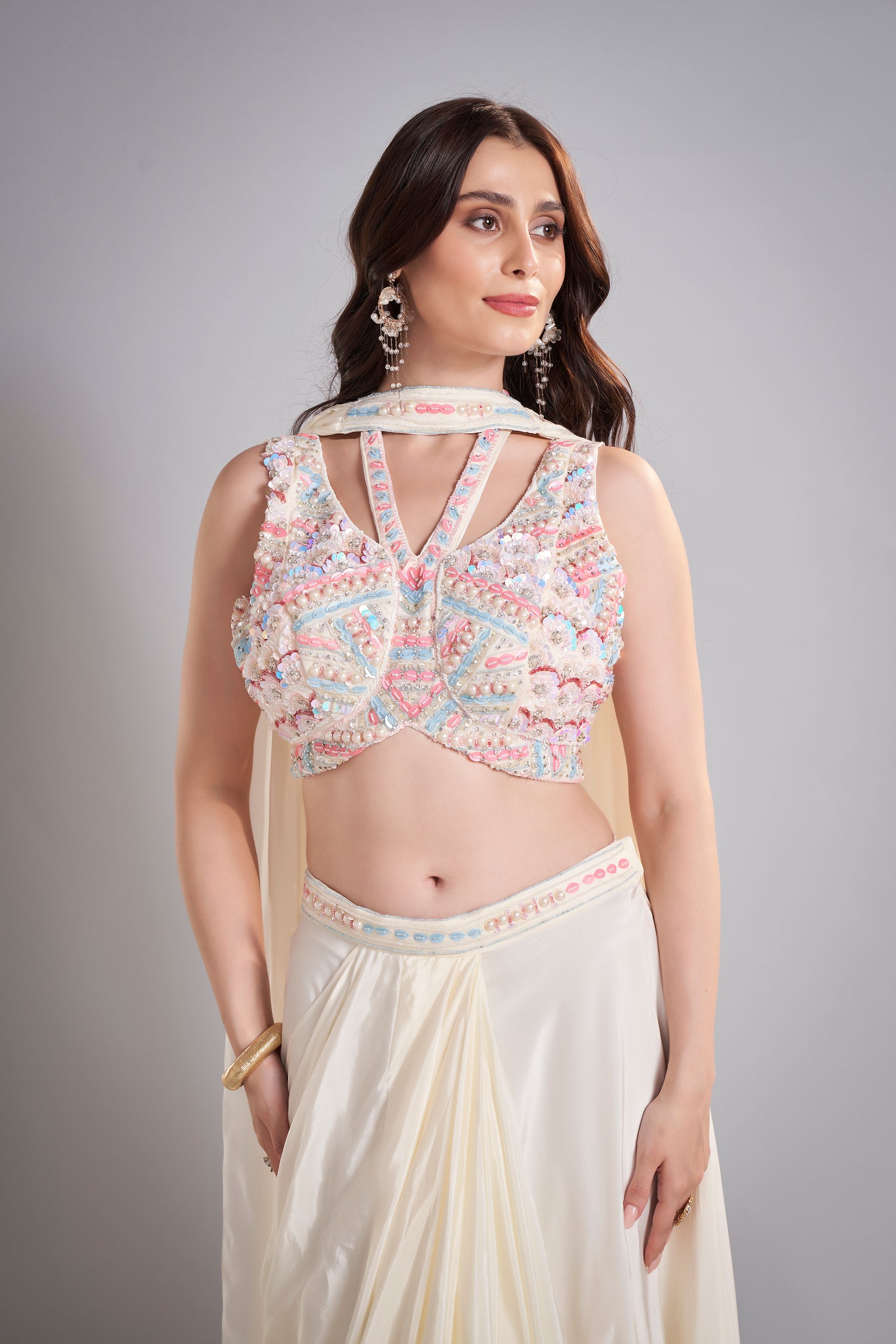 Ivory Draped Skirt with Pastel Embellished Crop Top & Flowing Drapes – Modern Wedding Reception Outfit