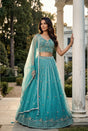 Ethereal, refreshing, and gracefully radiant, the Aqua Blue Embroidered Lehenga Set captures the serenity of soft hues blended with intricate craftsmanship. The delicately embellished blouse is adorned with fine thread and zari embroidery, creating a subtle shimmer against the soothing aqua tone. The voluminous lehenga flows effortlessly with airy layers, dotted with delicate motifs and finished with an ornate embroidered border. Paired with a sheer dupatta that drapes with fluid elegance, this ensemble is perfect for daytime weddings, garden celebrations, and festive occasions where light meets luxury.