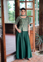 Rich, regal, and effortlessly captivating, the Emerald Zari Sharara ensemble exudes a deep forest elegance infused with timeless craftsmanship. The intricately embroidered kurta is adorned with delicate zari patterns and heritage motifs that shimmer subtly against the lush emerald base. Paired with a fluid, wide-legged sharara that moves with graceful ease and a coordinated dupatta that completes the silhouette, this ensemble radiates quiet luxury. Perfect for evening celebrations, wedding festivities, and refined cultural gatherings, it captures the essence of modern royalty wrapped in traditional artistry.