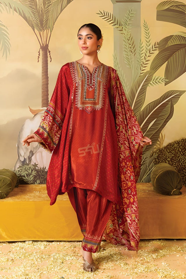 Rooted in tradition and rich in artisanal charm, the Vermilion Heritage Printed Kurta Salwar Ensemble celebrates timeless Indian elegance with a soulful, earthy appeal. The warm vermilion kurta is adorned with intricate heritage-inspired prints and an ornate embroidered neckline that adds depth and character to the silhouette. Paired with coordinated salwar pants and a beautifully patterned dupatta, the ensemble flows with effortless grace. Designed for festive occasions, cultural celebrations, and daytime gatherings, this look embodies heritage craftsmanship balanced with relaxed sophistication.