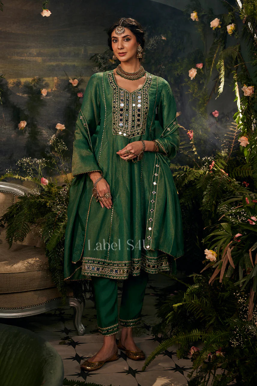 Regal and captivating, the Emerald Green Mirrorwork Anarkali Set is designed for moments that call for grandeur and elegance. Rendered in a rich emerald green hue, this flowing Anarkali features exquisite mirrorwork detailing across the neckline and bodice, beautifully balanced with fine embroidery throughout. The voluminous silhouette creates graceful movement, while the coordinated dupatta with mirror accents adds a striking finishing touch. This ensemble is a perfect blend of traditional artistry and timeless sophistication, ideal for festive and celebratory occasions.