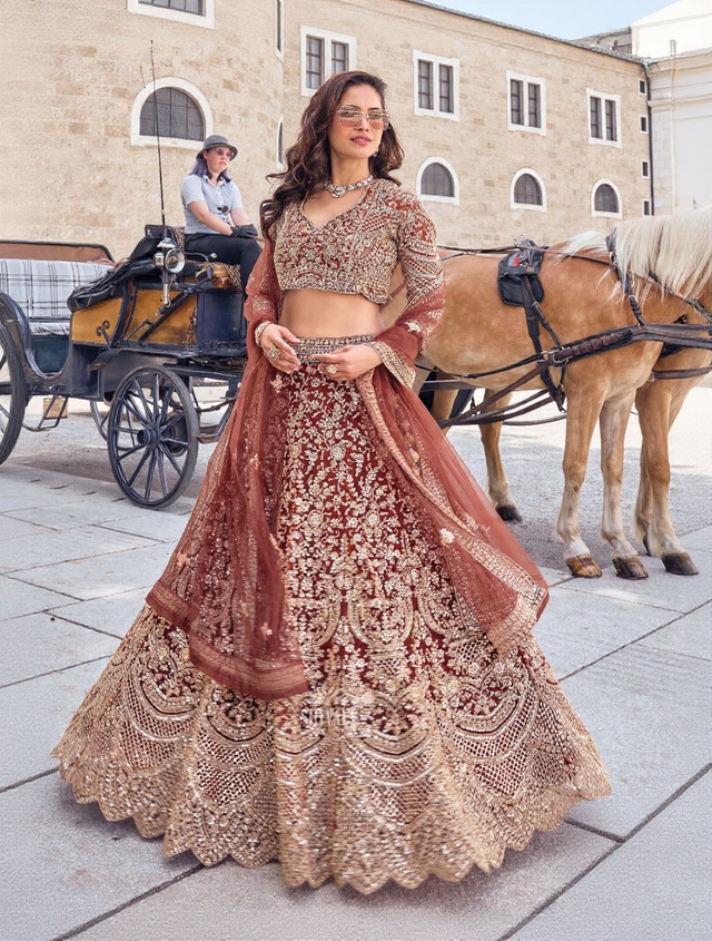 Majestic, opulent, and breathtakingly detailed, the Imperial Rust Gold Bridal Lehenga is a masterpiece of heritage craftsmanship. Drenched in a rich rust hue, the blouse and lehenga are adorned with intricate gold zari, sequins, and thread embroidery that shimmer with regal intensity. The voluminous skirt blooms with elaborate architectural and floral motifs, finished with a grand scalloped border that commands attention. Paired with a sheer embroidered dupatta that drapes with royal elegance, this ensemble is designed for weddings, bridal receptions, and grand celebratory moments.