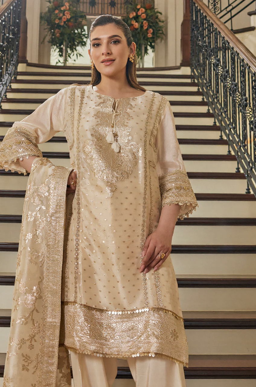 Elevate your ethnic wardrobe with this breathtaking Ivory Gold Embroidered Kurta Set with Dupatta, crafted for women who love timeless elegance and regal charm. Designed in a soft ivory tone, this outfit is beautifully enhanced with rich golden embroidery and delicate sequin detailing, creating a graceful festive look.