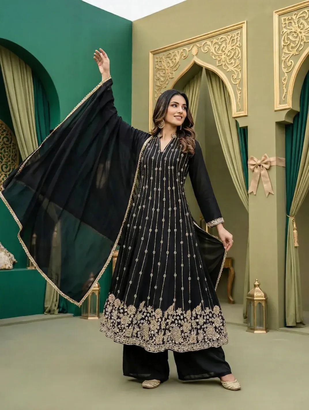 Timeless, graceful, and effortlessly regal, the Midnight Noir Embroidered Anarkali Set is designed to make a statement at every celebration. Crafted in a deep black hue, the flowing Anarkali features delicate vertical gold embroidery that elongates the silhouette, while the richly detailed floral border at the hem adds opulence and grandeur. Paired with wide palazzo pants and a sheer dupatta edged in gold trim, this ensemble captures classic sophistication with contemporary finesse. Perfect for festive evenings, wedding functions, and formal gatherings, it embodies understated luxury.