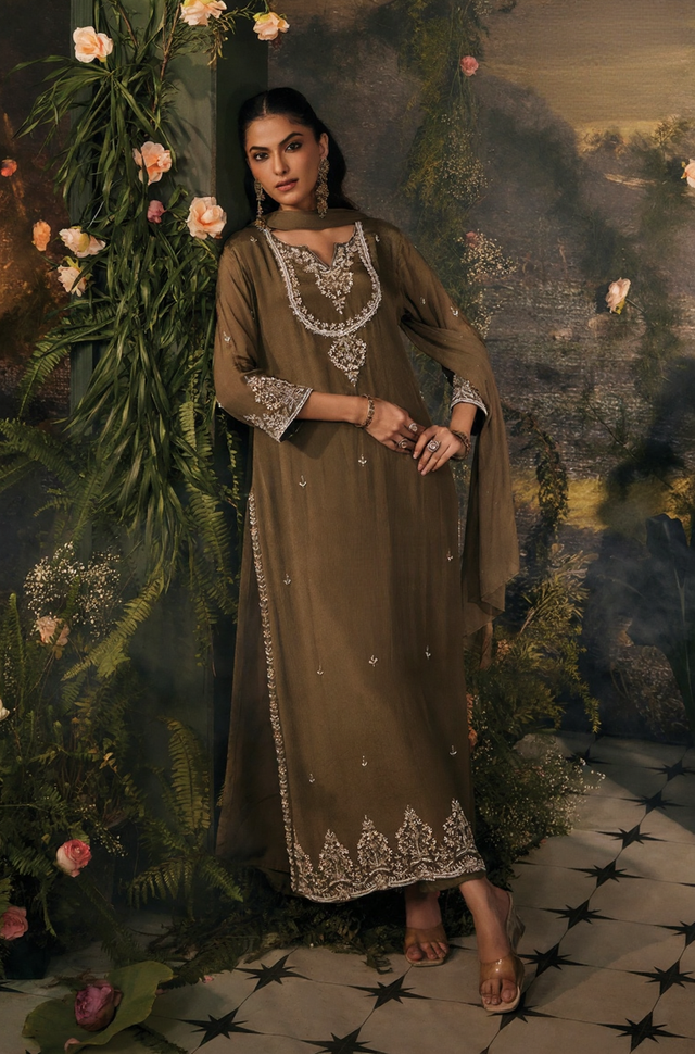 Understated yet undeniably refined, the Olive Aura Embroidered Long Kurta Set captures timeless elegance in a deep earthy olive tone. Delicate silver embroidery frames the neckline, sleeves, hem, and side panels, creating a graceful silhouette that feels both regal and effortlessly wearable. The flowing structure and coordinated dupatta make this ensemble perfect for intimate celebrations and sophisticated festive gatherings.