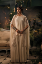 Graceful, majestic, and exquisitely refined, the Regal Ivory Embellished Cape Ensemble is designed for grand celebrations. Crafted in a soft ivory hue, this flowing silhouette features delicate gold embellishments across the cape and bodice, creating a statement look that radiates luxury. The layered drape and wide-leg base add movement and regal charm, making it perfect for formal festive occasions.