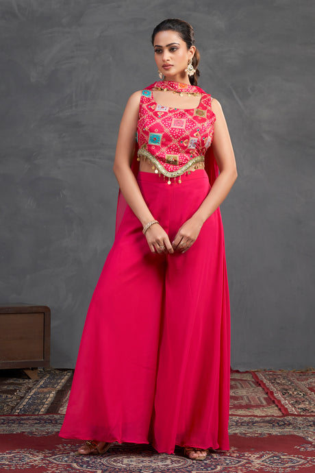Hot Pink Drape Skirt Set with Handcrafted Crop Blouse