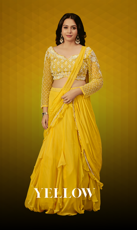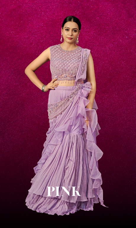Lavender Embellished Crop Top with Ruffled Saree Skirt & Pre-Draped Pallu
